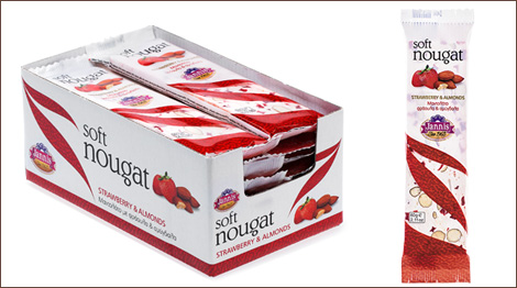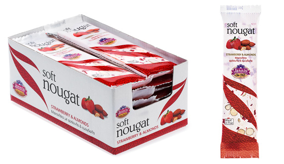 Jarabe de Glucosa, pure de fresas 16%, pulpa de fresa 34%, almendras 14%, miel, coco, clara de huevo y vainilla.