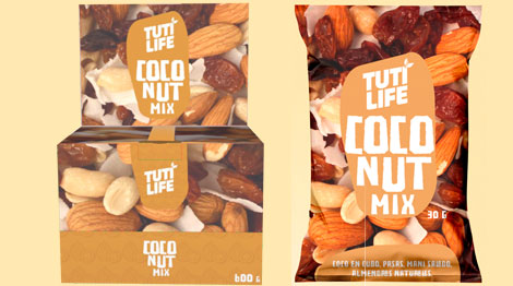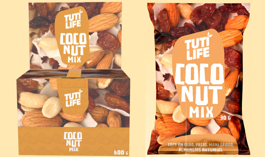 Tutilife Coconut Mix - Código de producto: tutti-01 - 20 unidades por display - 30 gr por producto Ingredientes Coco en cubo, pasas, maní salado y almendras naturales.