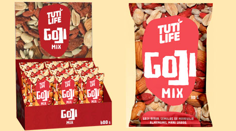 Tutilife Goji Mix - Código de producto: tutti-03 - 20 unidades por display - 30 gr por producto Ingredientes Goji Berry, semillas de maravilla, almendras naturales y maní salado.